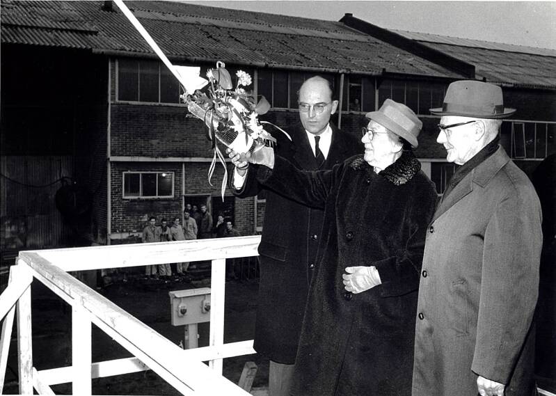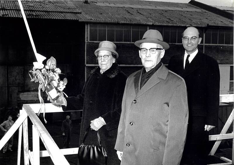 Jan Boon en Janna de Ruijter tijdens de tewaterlating van het schip de 'Jan Boon'.