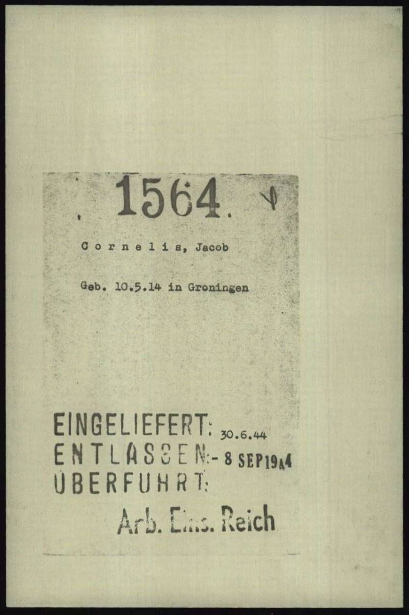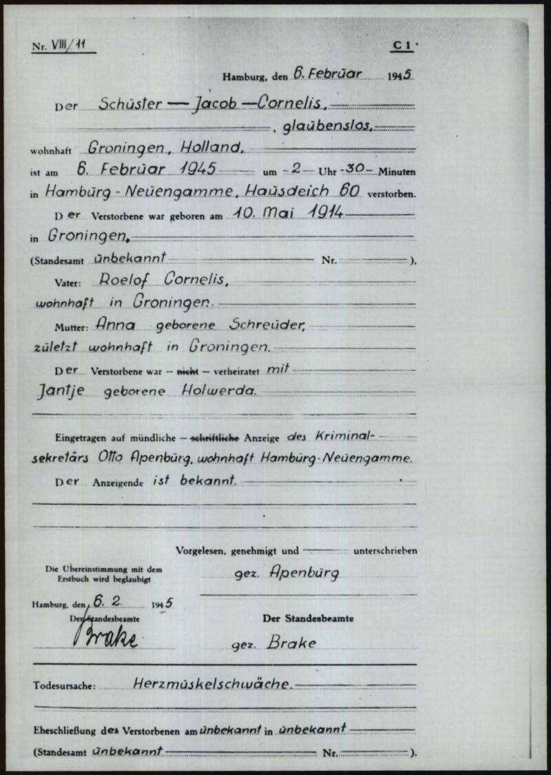 Jacob Cornelis overleed in krijgsgevangenschap te Neuengamme (D) Lager Hausdeich 60 op 06-02-1945, volgens de papieren leed hij aan een hartzwakte, gecremeerd te Hussum (D) Aussenstelle Neuengamme in februari 1945.